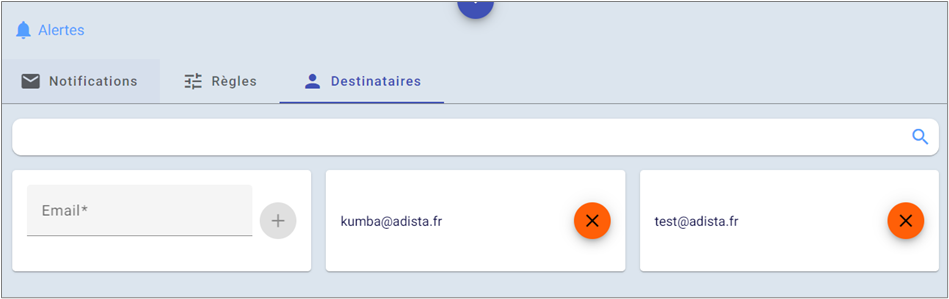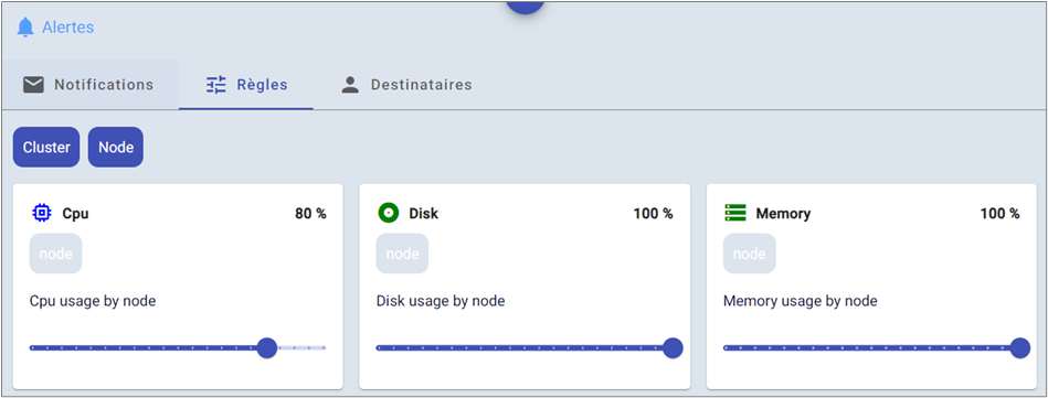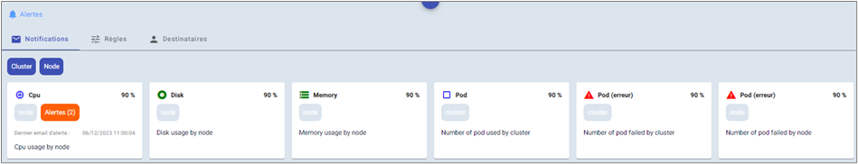 Le module Alertes permet de générer des notifications par e-mail lorsque certaines ressources dépassent les seuils définis. Il est composé de trois onglets, chacun dédié à une fonctionnalité spécifique :