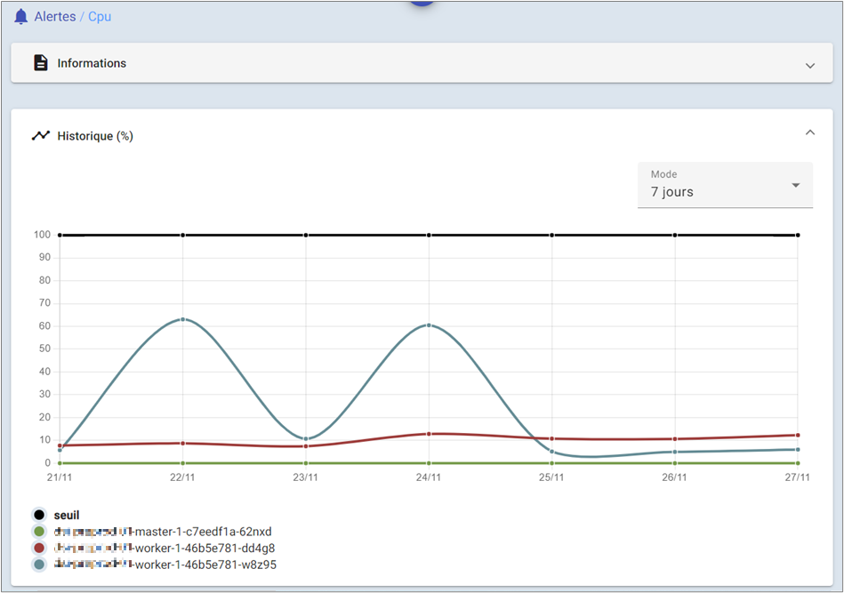 Le graphique permet de visualiser les courbes de consommation sur une période paramétrable. Une courbe noire représente le seuil, accompagnée d’une légende pour faciliter l’analyse.