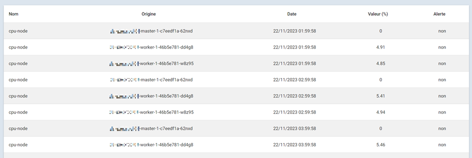 Si une ressource dépasse son seuil, une pastille orange indique le nombre d’alertes détectées. Si un e-mail d’alerte a été envoyé, une ligne affiche la date et l’heure de l’envoi.