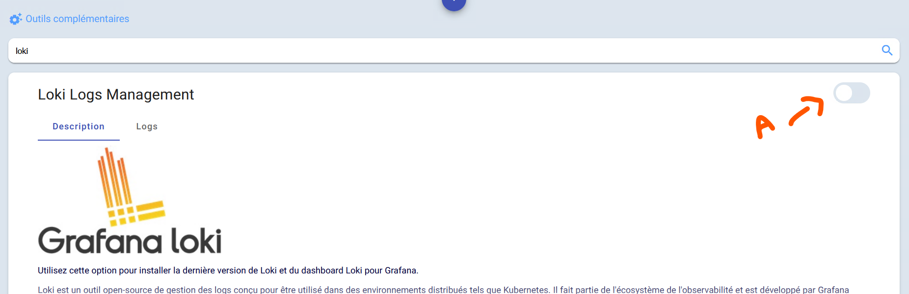 Pour installer un outil, il suffit d’activer le switch (flèche rouge A).