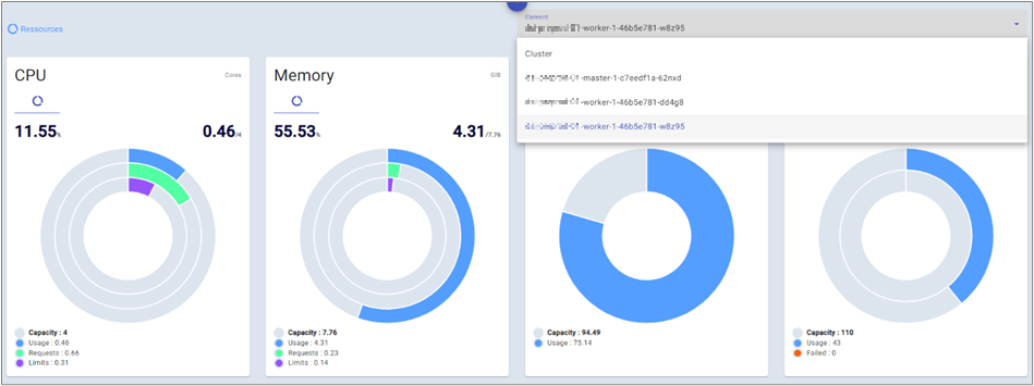 Le filtre propose deux types d’options, une vue de la consommation des ressources sur l'ensemble du cluster (similaire au bandeau de ressources) ou une approche plus spécifique permettant de sélectionner un nœud.