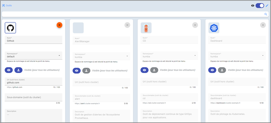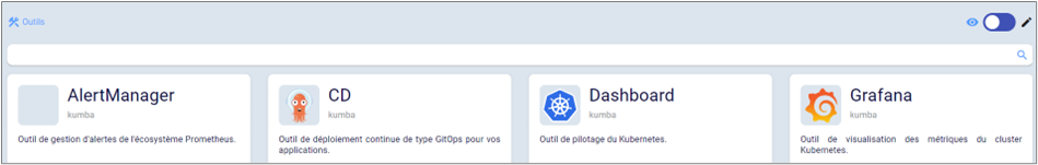 Pour rendre un outil installé sur le cluster accessible et visible dans les points de menu, il suffit de spécifier un sous-domaine. Par exemple, si votre interface kumba est accessible à l’adresse :